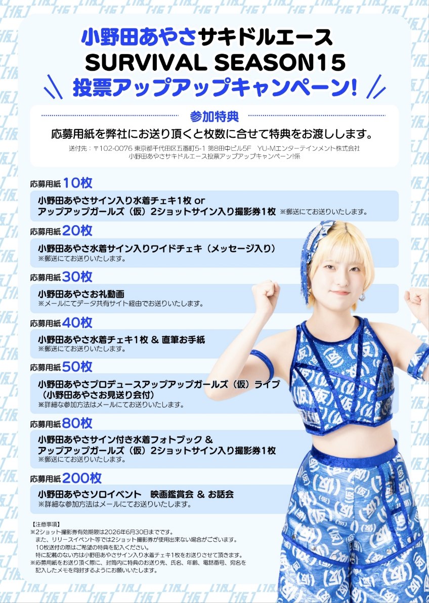 「サキドル エース SURVIVAL」SEASON15のアンケート欄に[⑦小野田あやさ アップアップガールズ(仮)]を記載した応募用紙10枚ごとに1口