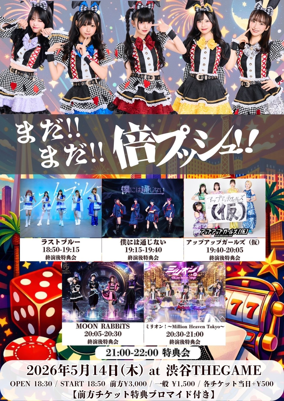 出演:ミリオン!〜Million Heaven Tokyo〜 / MOON RABBiTS/僕には通じない / ラストブルー/ アップアップガールズ(仮)